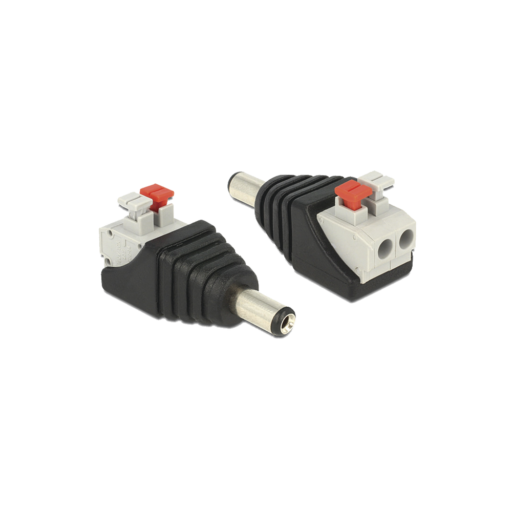 Adaptador tipo jack de 3.5 mm macho polarizado de 12 Vcc con terminales tipo push.