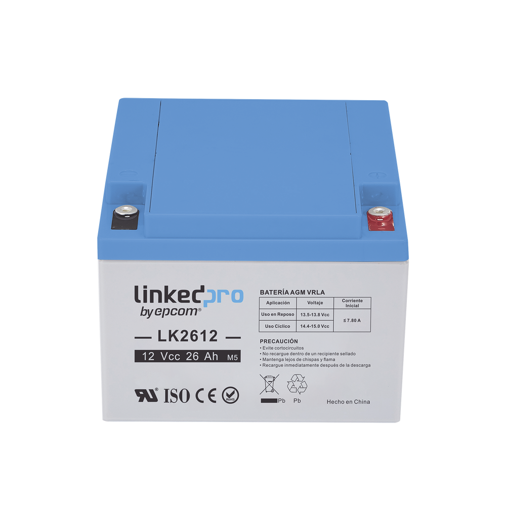 La serie de baterías LINKEDPRO, están diseñadas con tecnología AGM-VRLA (Fibra de vidrio absorbente, con válvulas de regulación), placas de alto rendimiento y electrólito para proporcionar una salida de energía adicional. Las baterías de la serie LINKEDPRO BY EPCOM son baterías de respaldo para equipos electrónicos, con una vida útil de diseño flotante de 5 años a 25°C, están aprobadas por UL (MH62092).