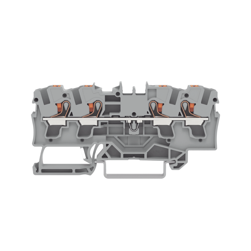 Borna de paso profesional para 4 conductores con tecnología Push-in CAGE CLAMP® que permite conexiones rápidas y seguras sin herramientas para conductores de hasta 4 mm². Diseñada para montaje en carril DIN 35 x 15 y 35 x 7,5 mm, cuenta con certificaciones ATEX e IECEx para uso en áreas peligrosas. Incluye orificio de prueba de Ø4 mm para mediciones sin desconexión y marcaje lateral y central para identificación. Fabricada en poliamida PA 66 con clasificación UL 94 V0 para alta resistencia al fuego y temperatura de operación desde -60°C hasta +105°C.