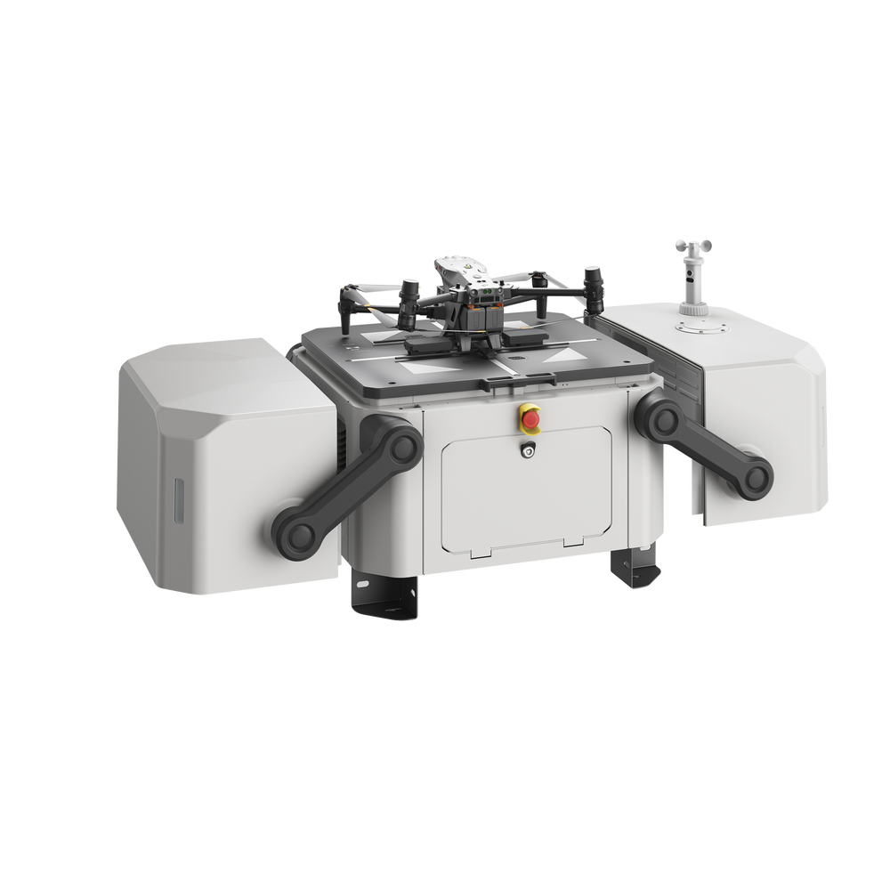 Los DJI Docks son robustos, confiables y están diseñados para funcionar 24/7, día y noche, con lluvia o sol. Cada Dock alberga un Matrice 30 donde aterriza, se recarga, despega y ejecuta misiones programadas en DJI FlightHub 2.