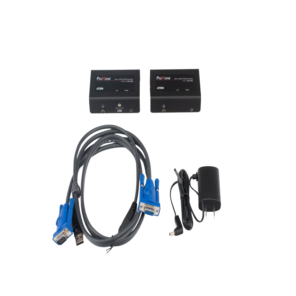Contenido del paquete: 1x extensor KVM mini USB CE100L (unidad local), 1x extensor KVM mini USB CE100R (unidad remota), 1x cable KVM (VGA, USB; 1,5 m/5 pies), 1x adaptador de corriente (para unidad remota), 1x kit de montaje, 1x Instrucciones de usuario.