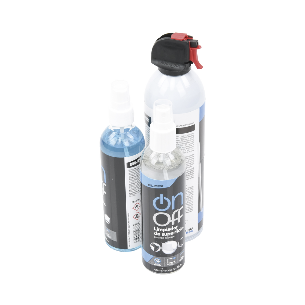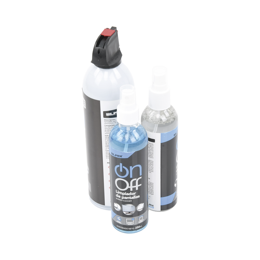 Elimina el polvo de tus equipos con el Aire Comprimido On/Off. Rocía y aplica el Limpiador de Equipos Electrónicos On/Off en la Microfibra y limpia el exterior de tus aparatos electrónicos (no pantallas). Rocía y aplica el Limpiador de Pantallas On/Off en la otra Microfibra y limpia cualquier tipo de pantallas.