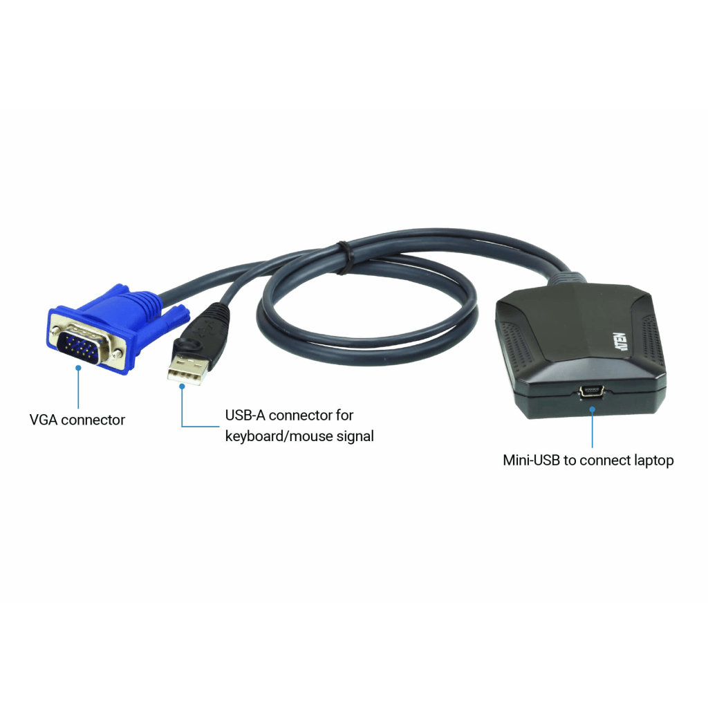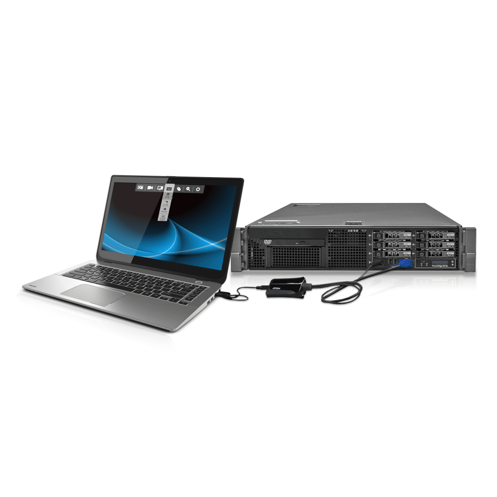 El CV211 de ATEN es un adaptador para consola KVM USB diseñado para administradores de TI móvil frustrados. Es el sustituto perfecto para el carrito de emergencia, ya que convierte el ordenador portátil en una consola KVM que combina la funcionalidad de un conmutador, una caja de captura, un DVD-ROM externo, un teclado, un ratón y un monitor en una unidad compacta y práctica. Podrá diagnosticar y resolver de forma rápida y profesional servidores, cajeros automáticos o sistemas de punto de venta.