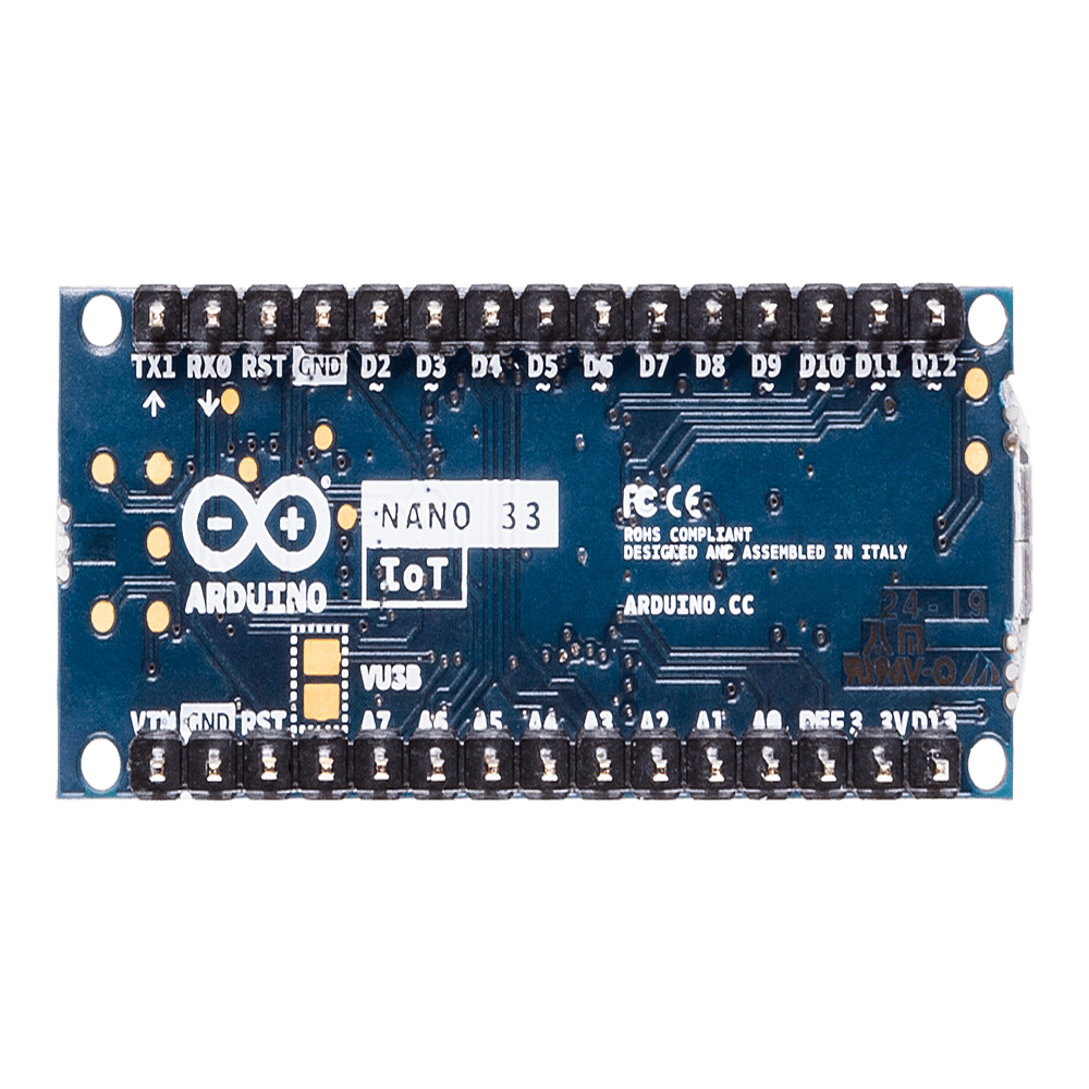 La Arduino Nano 33 IoT es una placa de desarrollo compacta diseñada específicamente para aplicaciones de Internet de las Cosas. Equipada con un procesador Arm Cortex-M0+ SAMD21G18A operando a 48 MHz, ofrece 256 kB de flash y 32 kB de SRAM para el procesamiento de aplicaciones. Integra un módulo NINA-W102 basado en ESP32 que proporciona conectividad Wi-Fi 802.11 b/g/n y Bluetooth 4.2 BR/EDR/BLE dual mode. La placa incluye un chip criptográfico ATECC608A para almacenamiento seguro de claves y certificados, además de una unidad de medición inercial LSM6DSOXTR de 6 ejes para aplicaciones de sensado de movimiento. Compatible con el ecosistema Arduino, soporta programación mediante Arduino IDE, Arduino Cloud Editor y integración con Arduino Cloud para proyectos IoT profesionales.
