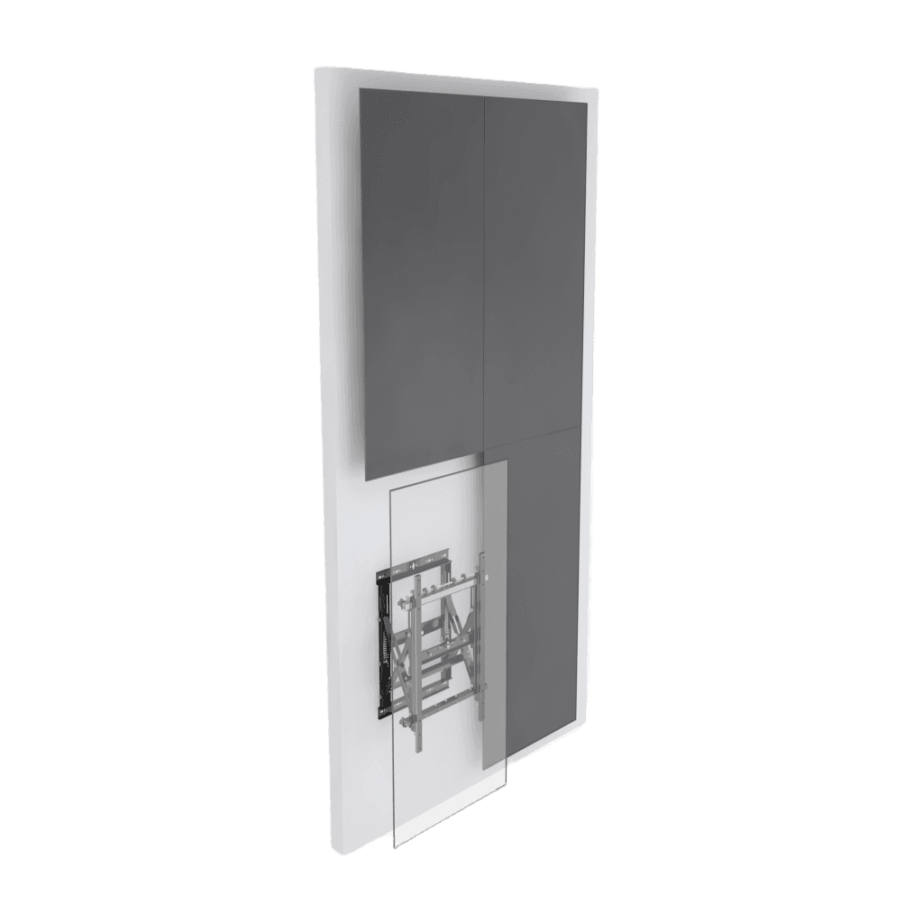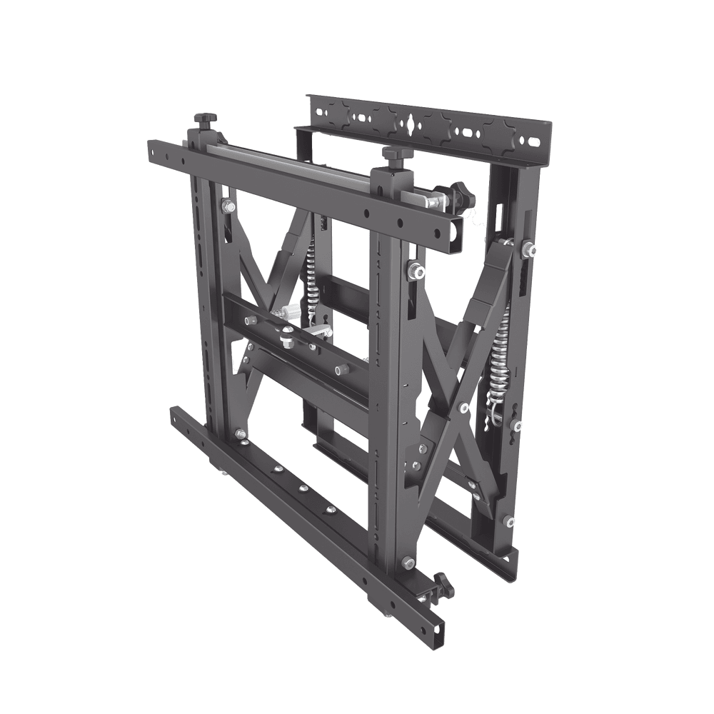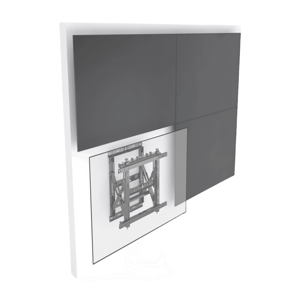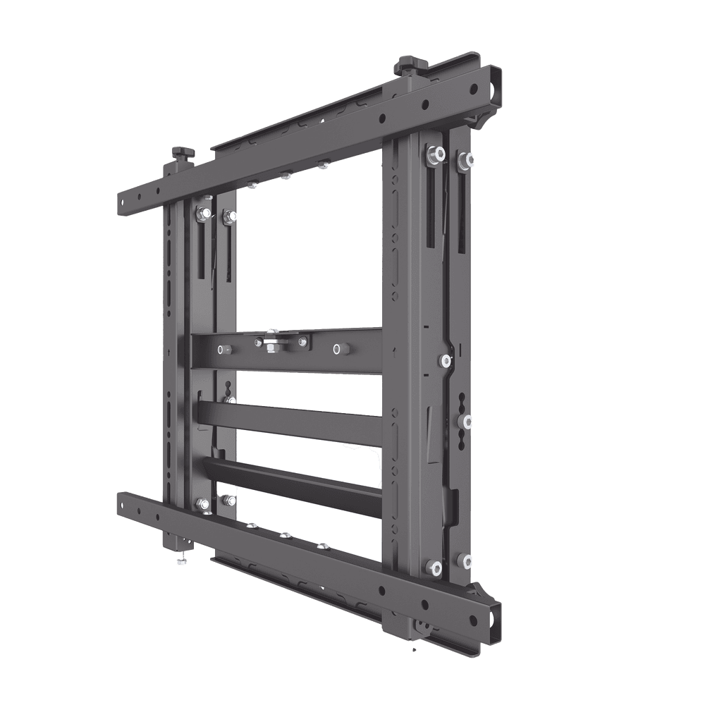 - Diseñado para que la instalación de videowalls sea lo más rápida y sencilla posible, este soporte modular para videowalls se puede utilizar para crear configuraciones ilimitadas de videowalls tanto en formato horizontal como vertical. El sistema desplegable permite un acceso rápido y sencillo a la parte posterior de las pantallas montadas para realizar tareas de mantenimiento.