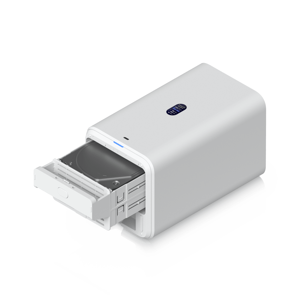 NAS de montaje en escritorio con (2) bahías para discos de 3.5′, puerto 2.5 GbE, alimentación PoE++ y gestión mediante UniFi Drive, con RAID 1 y funciones de respaldo, cifrado y compartición.